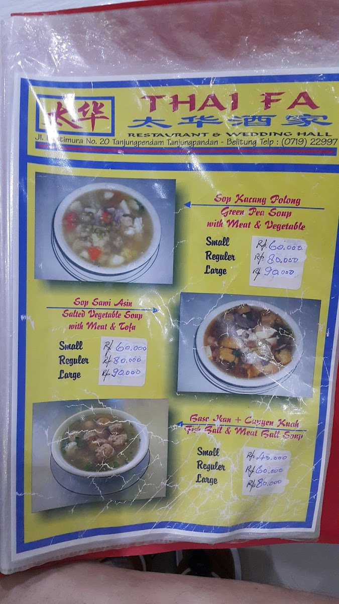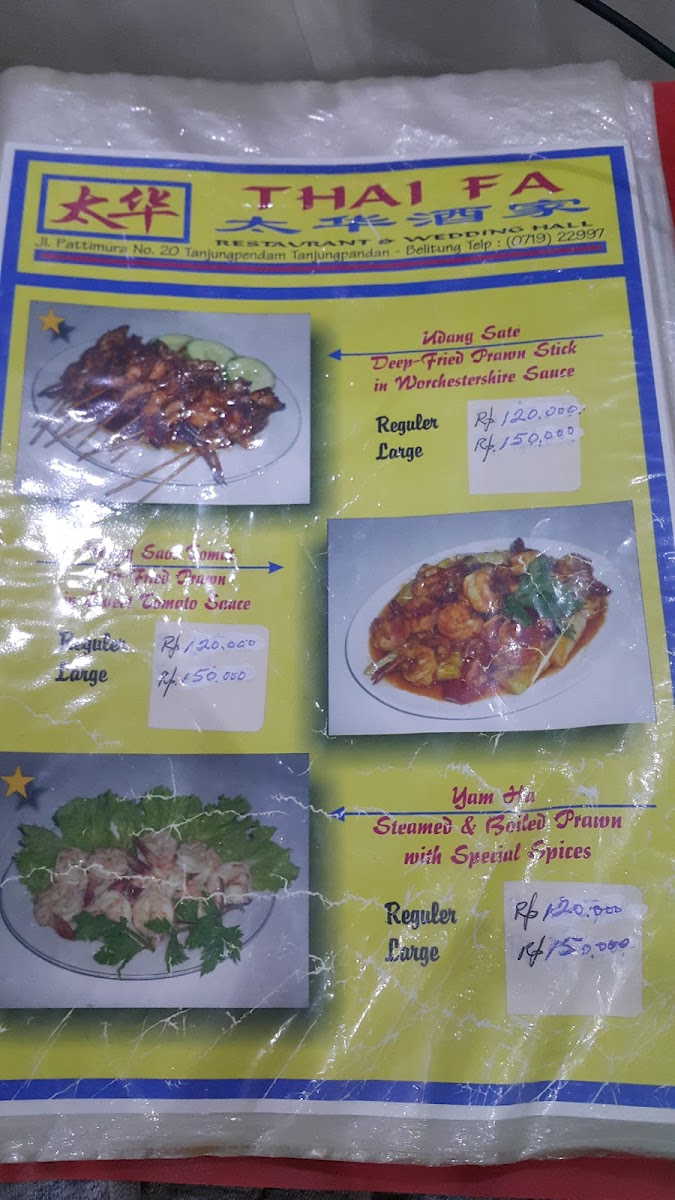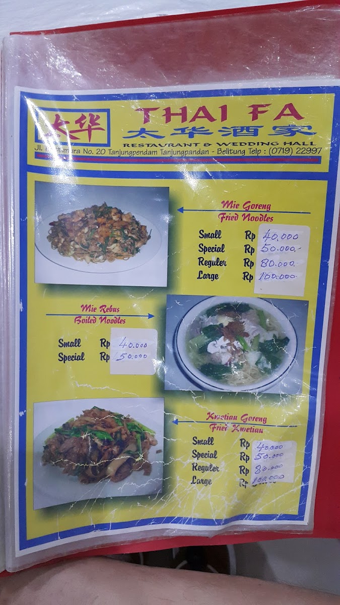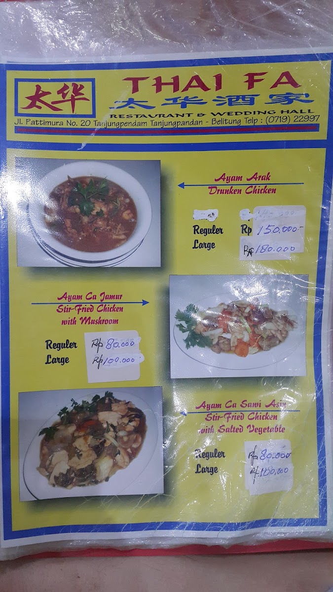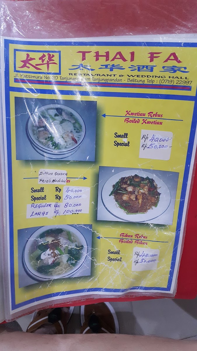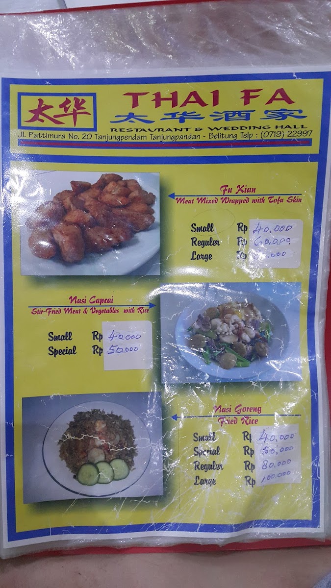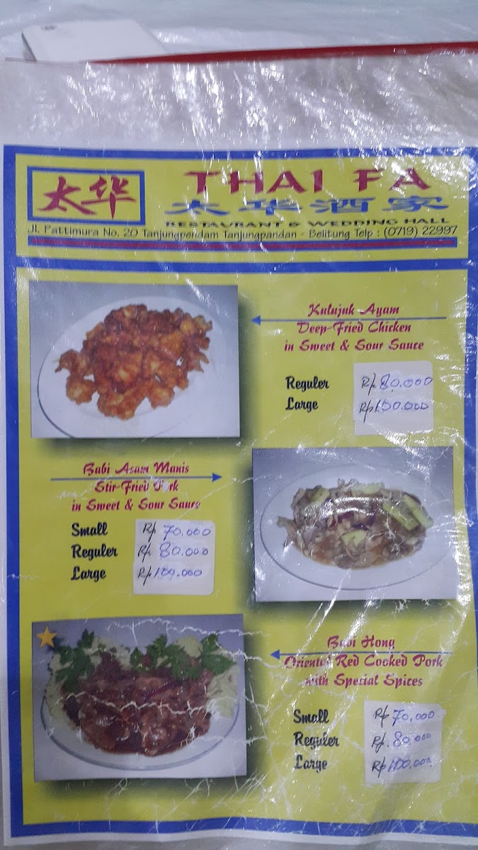 At Restoran Thai Fa on Jl. Pattimura No.20, the menu comes across as a well-rounded showcase of comforting Asian staples and seafood-forward specialties, presented with an everyday, no-frills appeal. The playful Carbo Loading After 10k sets a casual tone, pairing nicely with familiar rice and noodle options like Nasi Goreng and Mie Goreng, which feel designed to satisfy both locals and travelers looking for dependable flavors. Lighter starters such as Corn Soups balance the menu, while homestyle dishes like Mun Tahu and Cap Jae emphasize warmth and simplicity. Seafood is clearly a highlight, from the sweet-savory profile of Cumi Nanas to the clean, comforting preparations of Ikan Kakap. For diners seeking something more distinctive, Kepala Ikan Sunuk and Ikan Sunuk Masak Tausi stand out as bold choices that reflect regional tastes and a confidence in handling fresh fish. Meat and vegetable combinations like Babi Sayur Asin, Nasi Capcai, and the classic sweet-and-sour Fu Yung Hai add variety and balance, ensuring the menu never feels one-dimensional. To finish, Es Jeruk Kunci offers a refreshing citrus note that neatly ties the meal together. Overall, the menu feels thoughtfully curated, with each dish contributing to a cohesive dining experience focused on satisfaction, familiarity, and local character rather than unnecessary complexity.